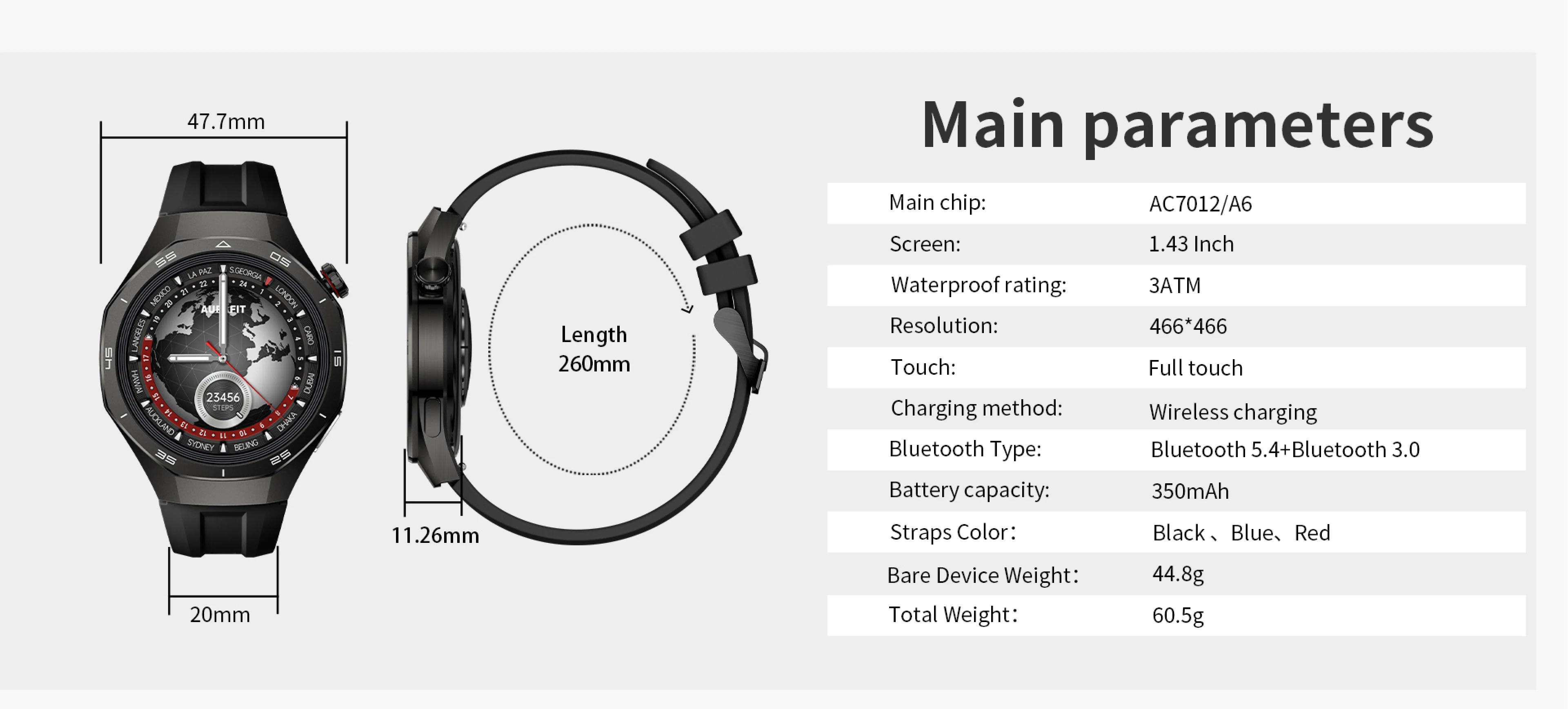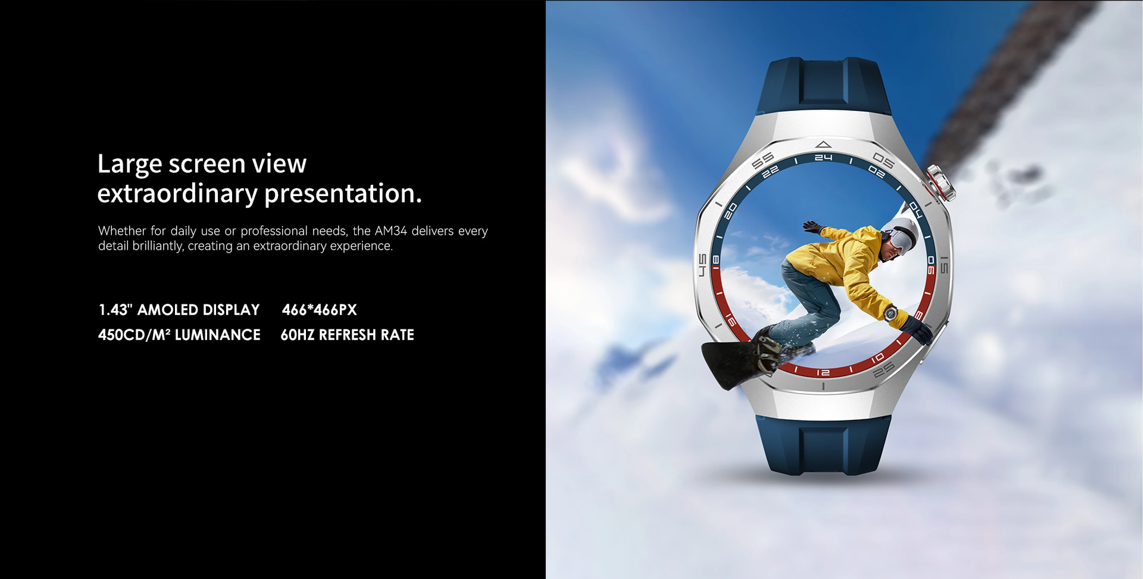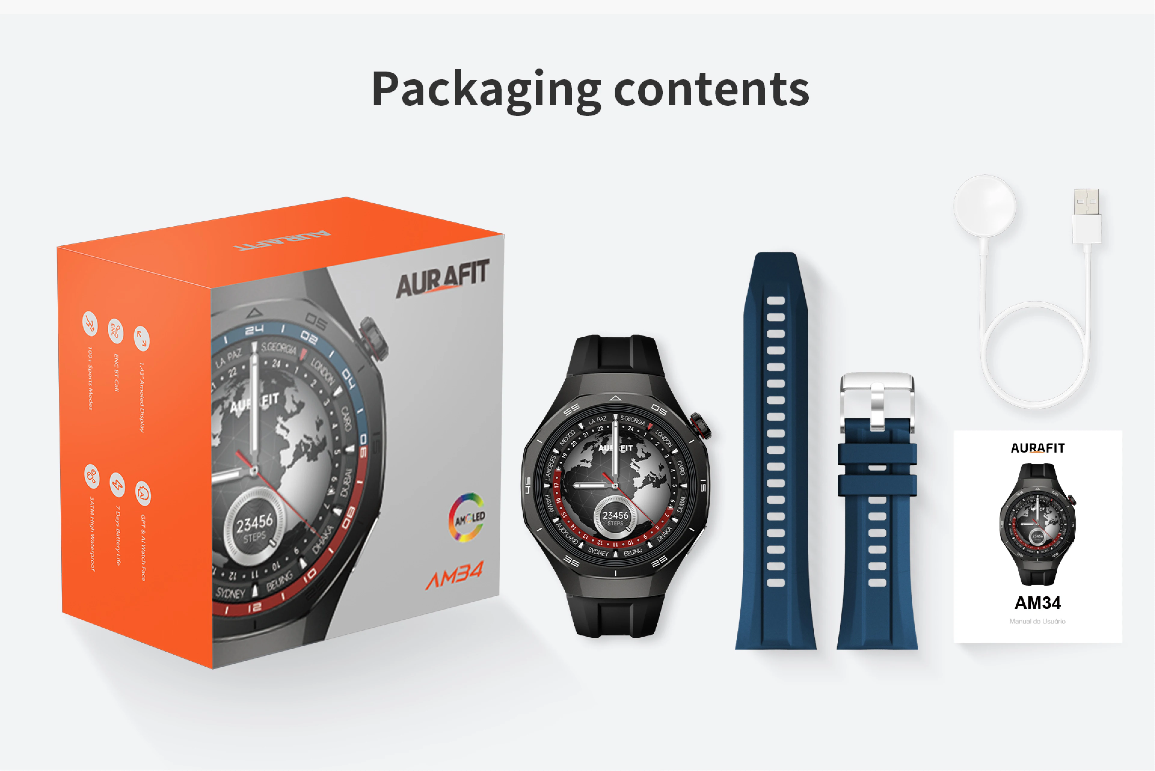 O relógio inteligente AURAFIT combina um design elegante e robusto, perfeito para negócios e aventuras. Sua tela AMOLED de 1,43 polegadas oferece cores vibrantes e excelente legibilidade, mesmo sob a luz do sol.